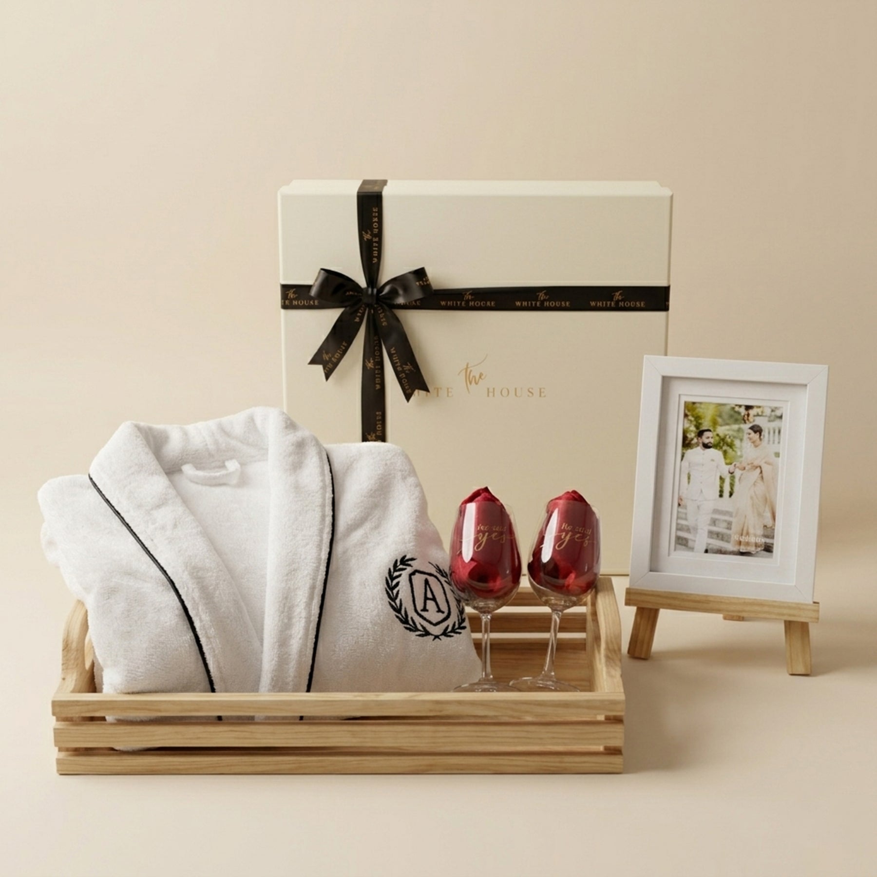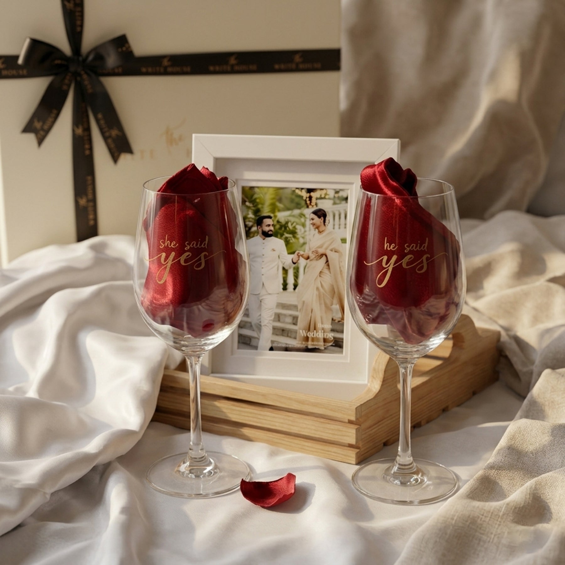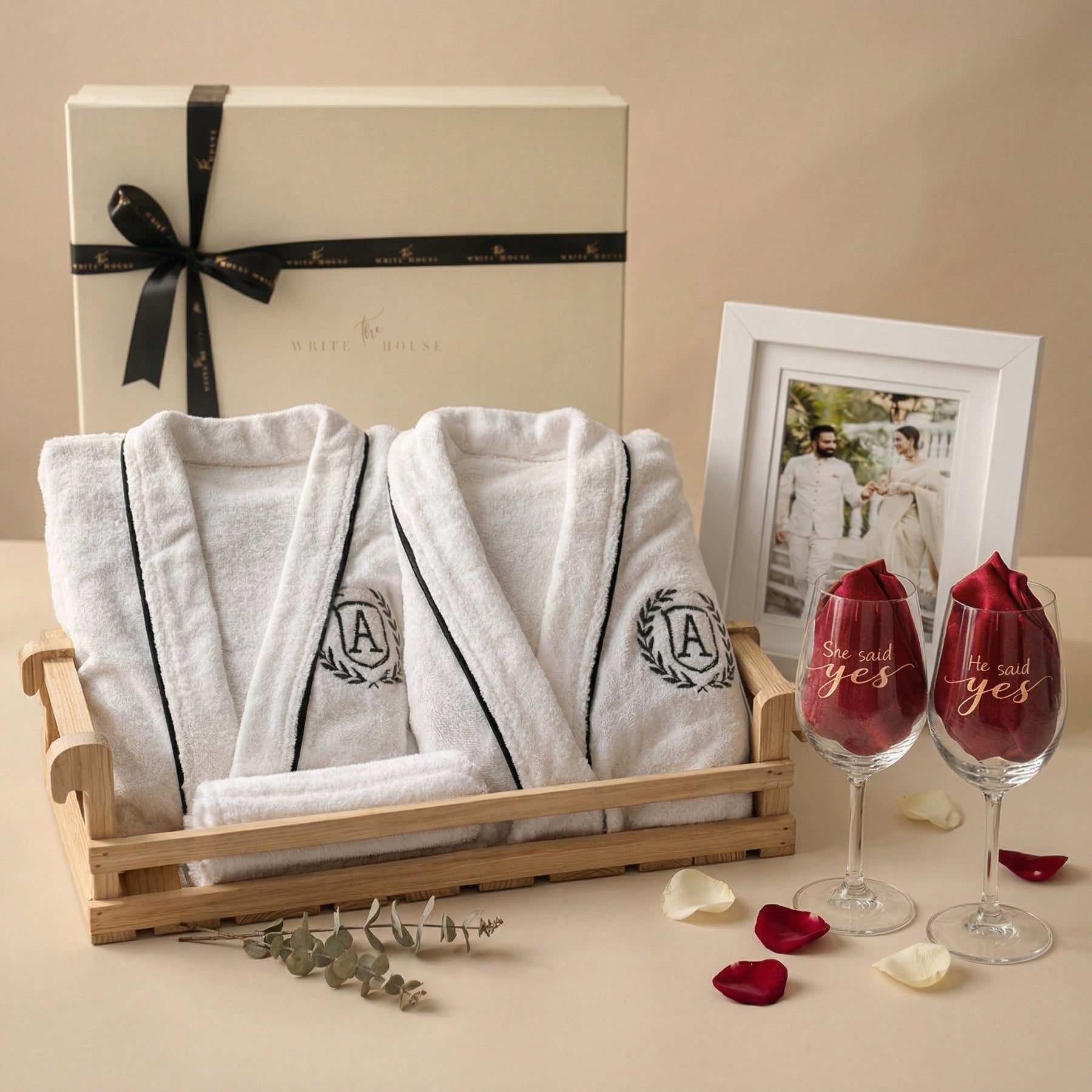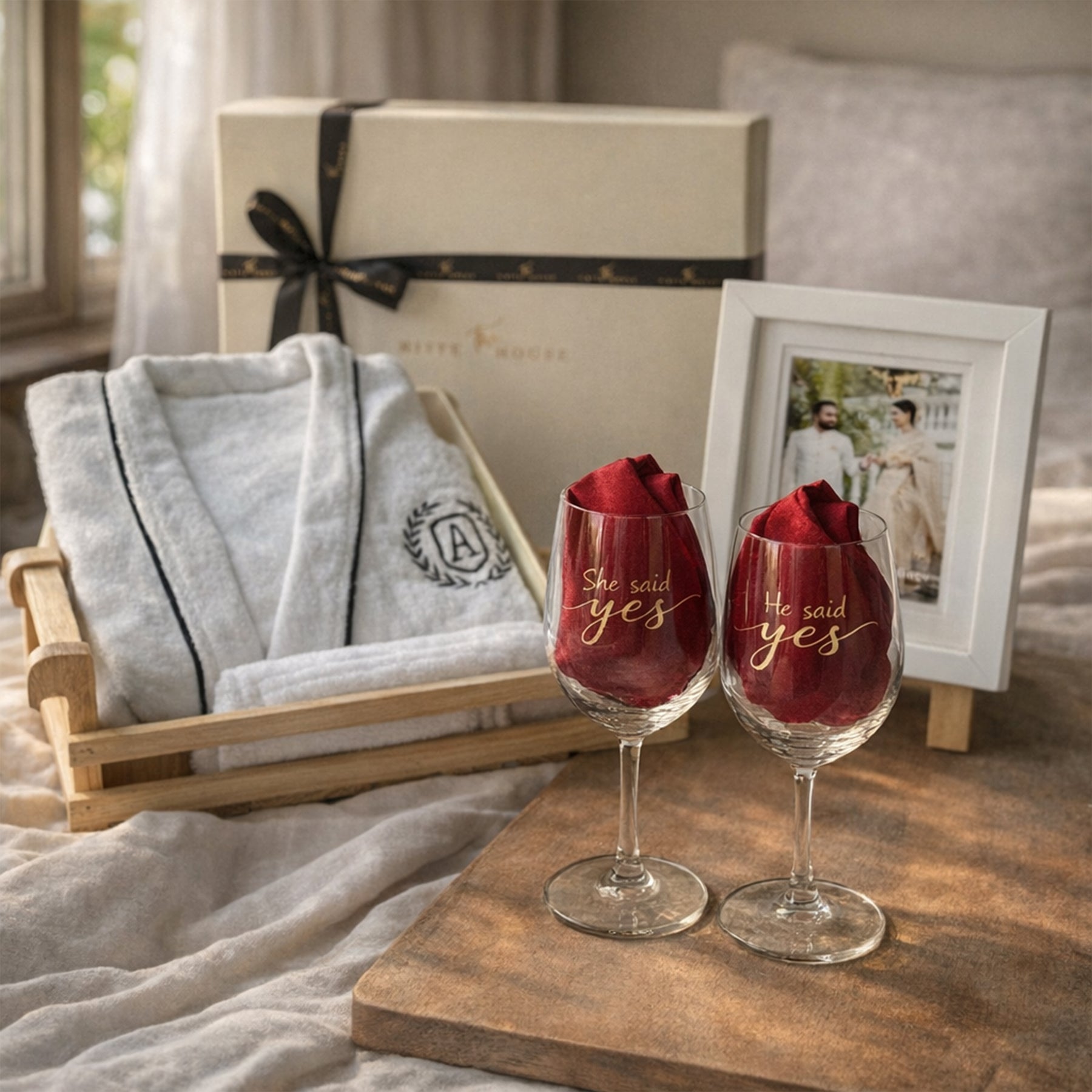 From plush personalised bathrobes to hand-engraved wine glasses that celebrate the “She Said Yes” moment, and a custom photo frame that captures a memory for a lifetime — every element is designed to feel special, intimate, and lasting.